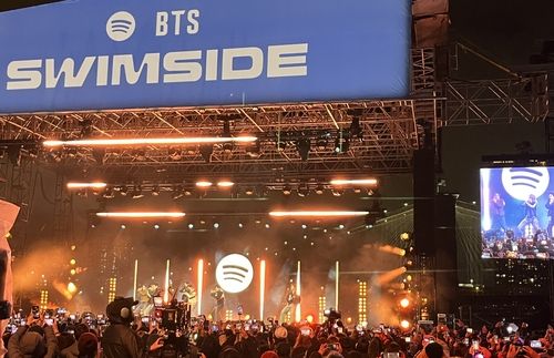 On March 23 (US time), BTS headlined the ultra-exclusive Spotify X BTS: Swimside event at Pier 17 Rooftop in New York City — marking their first full-group US performance in nearly four years.